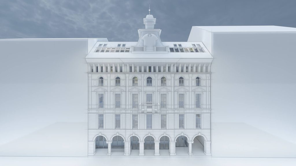- Moderní ocelovo-betonová konstrukce se zachovanou historickou fasádou.